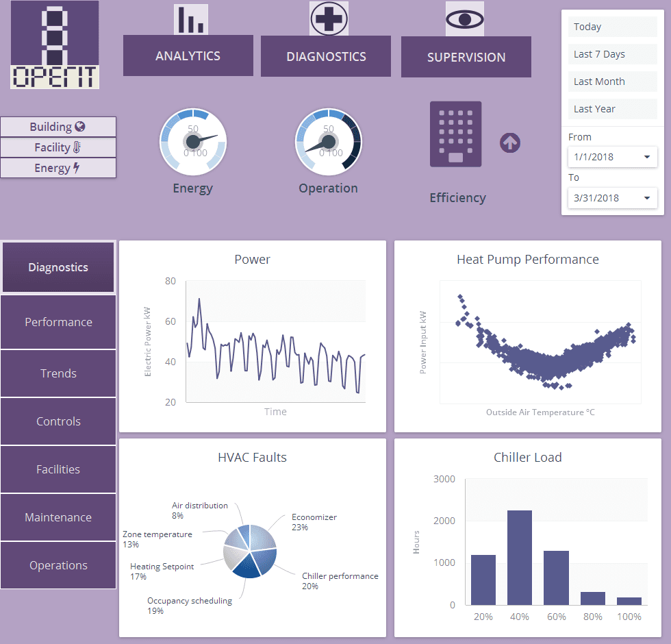 Diagnosis checklists. Display of tables, graphs and control schemes. Calculation of indicators and metrics. Performance evaluation of HVAC, mechanical and electrical systems. Use of procedures FDD (Fault Detection and Diagnostics).